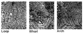 The complex and completely unique shapes on a person’s fingertips created by dermal papillae consist of geometrically formed patterns formed by ridge structures and pore configurations. While there are many different ways to classify fingerprints, this project deals with what scientists refer to as the level one classification system: large-scale pattern types. Nearly all fingerprints fall into four major categories: loops, whorls, arches, and accidentals (UCSMP Geometry). Loops are strongly curved patterns, the ends of which enter and exit the finger on the same side. Approximately 60% of all people have this type of fingerprint. Quite common as well, whorls (complete ovals) form 30% of the population’s fingerprints. However, only 5% of all people have arches, ridges that run across the fingers arching in the middle, or accidentals, a combination of two or more patterns. This particular project will statistically analyze and classify 20 different fingerprints to see if this data correspond to general percentages.